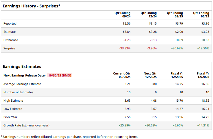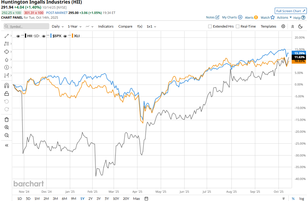 What to Expect From Huntington Ingalls’ Next Quarterly Earnings Report![]() Newport News, Virginia-based Huntington Ingalls Industries, Inc. (HII) designs, builds, overhauls, and repairs military ships in the United States. With a market cap of $11.3 billion, Huntington Ingalls operates through Ingalls, Newport News, and Mission Technologies segments. The industrial major is set to announce its third-quarter earnings before the markets open on Thursday, Oct. 30. Ahead of the event, analysts expect HII to report an EPS of $3.21, marking a notable 25.4% growth from $2.56 reported in the year-ago quarter. While the company has surpassed the Street’s bottom-line estimates twice over the past four quarters, it has missed the projections on two other occasions. For the full fiscal 2025, analysts project HII’s earnings to come in at $14.75 per share, up 5.7% from $13.96 per share reported in fiscal 2024. While in fiscal 2026, its earnings are expected to grow 14.3% year-over-year to $16.86 per share. ![]() HII stock prices have gained 11.9% over the past 52 weeks, outpacing the Industrial Select Sector SPDR Fund’s (XLI) 10.1% gains, but lagging behind the S&P 500 Index’s ($SPX) 13.4% returns during the same time frame. ![]() Huntington Ingalls’ stock prices soared 7.9% in a single trading session following the release of its better-than-expected Q2 results on Jul. 31. The company continued to make steady progress on its operational initiatives for the fiscal year 2025 and made targeted investments to stabilize its workforce and supply chain. Driven by a notable uptick in product as well as service revenues, HII’s overall topline grew 3.5% year-over-year to $3.1 billion, beating the Street’s expectations by 5.2%. Meanwhile, the company’s EPS dropped 11.9% year-over-year to $3.86, but surpassed the consensus estimates by a staggering 19.5%. Further, Huntington raised its full-year free cash from guidance from the previous range of $300 million - $500 million to $500 million - $600 million, boosting investor confidence. The consensus opinion on HII stock remains moderately optimistic, with an overall “Moderate Buy” rating. Of the 11 analysts covering the stock, opinions include three “Strong Buys,” seven “Holds,” and one “Moderate Sell.” As of writing, the stock is trading slightly above its mean price target of $287.60. On the date of publication, Aditya Sarawgi did not have (either directly or indirectly) positions in any of the securities mentioned in this article. All information and data in this article is solely for informational purposes. For more information please view the Barchart Disclosure Policy here. |