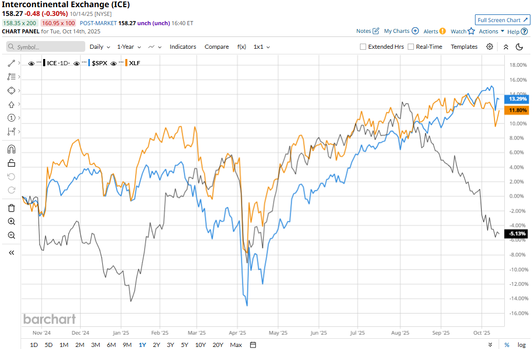 Earnings Preview: What To Expect From Intercontinental Exchange's Report![]() Atlanta-based Intercontinental Exchange, Inc. (ICE) engages in the provision of market infrastructure, data services, and technology solutions for institutions, corporations, and government entities. With a market cap of $90.9 billion, ICE operates through Exchanges, Fixed Income and Data Services, and Mortgage Technology segments. The financial giant is gearing up to announce its third-quarter earnings before the markets open on Thursday, Oct. 30. Ahead of the event, analysts expect ICE to report an adjusted EPS of $1.64, up 5.8% from $1.55 reported in the year-ago quarter. Moreover, the company has a robust earnings surprise history. It has met or surpassed the Street’s bottom-line estimates in each of the past four quarters. For the full fiscal 2025, ICE is expected to report an adjusted EPS of $6.87, up 13.2% from $6.07 reported in 2024. While in fiscal 2026, its earnings are expected to further surge 10.8% year-over-year to $7.61 per share. ![]() ICE stock prices have dipped 3.7% over the past 52 weeks, notably underperforming the Financial Select Sector SPDR Fund’s (XLF) 13.8% gains and the S&P 500 Index’s ($SPX) 13.4% returns during the same time frame. ![]() Despite delivering better-than-expected financials, Intercontinental Exchange’s stock prices observed a marginal dip in the trading session following the release of its Q2 results on Jul. 31. The company’s total revenues for the quarter increased 12.6% year-over-year to $3.3 billion. Meanwhile, its revenues net of transaction expenses surged 9.8% year-over-year to a record $2.5 billion, surpassing the Street’s expectations. Further, its adjusted net income grew by an impressive 19.1% year-over-year to more than $1 billion, and its adjusted EPS of $1.81 surpassed the consensus estimates by 2.3%. The drop can be attributed to the broader market downturn observed during the trading session, due to tensions over tariff changes. Analysts remain highly optimistic about the stock’s prospects. ICE maintains a consensus “Strong Buy” rating overall. Of the 19 analysts covering the stock, opinions include 13 “Strong Buys,” two “Moderate Buys,” and four “Holds.” Its mean price target of $202.82 suggests a 28.1% upside potential from current price levels. On the date of publication, Aditya Sarawgi did not have (either directly or indirectly) positions in any of the securities mentioned in this article. All information and data in this article is solely for informational purposes. For more information please view the Barchart Disclosure Policy here. |